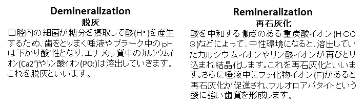 また、歯のエナメル質・セメント質は唾液の成分によって保護されていますが、砂糖(ショ糖)の入った食物などの摂取でひとたび環境が変わると、少しずつ脱灰が進んでいきます。